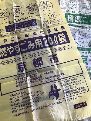 (社会で、2学期には「ゴミについての学習」をします。京都市のゴミぶくろには、こごみちゃん、エコちゃんが のってます。1ふくろの ごみを もやすのに かかる ひようも 書かれているよ。見てみてね。)