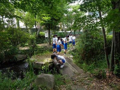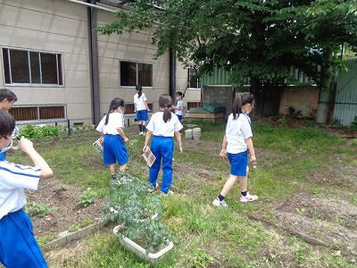 理科では、久しぶりに学習園やビオトープに出て、虫めがねを使って生き物や植物の観察をしました。