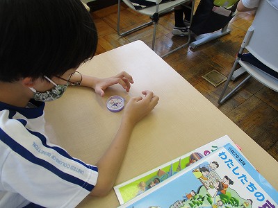 4校時は、社会です。はじめは『方位じしん』を使って、3年生教室での八方位を確認しました。