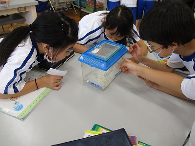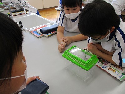 モンシロチョウの観察です。理科室でお世話をしているサナギが羽化し、モンシロチョウになりました。幼虫、モンシロチョウの観察をしています。