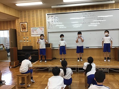 次の時間は、グループみんなの“ヤッホー”を繰り返したり、重ねたり、交互にしたりと、“ヤッホーで音楽作り”に取り組む予定です。