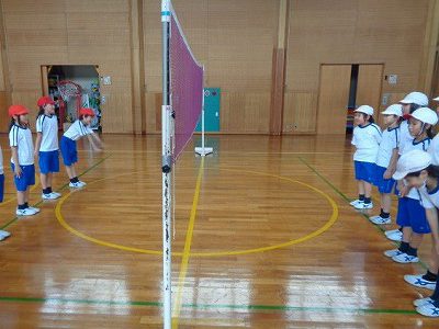 気合い十分の挨拶後、サーブを順番に交代しながら、両チームとも本気のプレイ。途中は、すべりこむ感じでレシーブするプレイも出るなど、一生懸命でした。