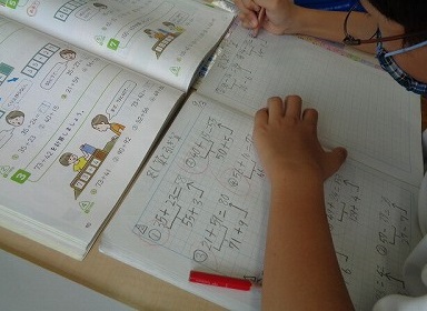 算数の「たし算とひき算」の学習です。暗算をする時、足す数・引く数の上の位から計算する方法を確認して計算に取り組みました。