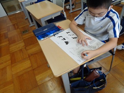 理科は「昆虫のすみか」のまとめの学習として、「自分だけのオリジナル昆虫公園」を作る計画を立てました。来て欲しい昆虫と、そのために必要な木、花、池などを考えながらプリントに書き込んでいます。