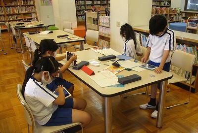 社会では、お店のはたらきについての学習をしています。前回は、お店の種類を考えましたが、それらをもとに週末の調べ学習の書き方について確認しました。その後、お店の工夫について映像を見たり、ノートにまとめたりしました。