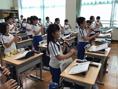 リコーダーの学習は、ようやく“高いレ”の音まで届きました。音楽室で指の確かめと、「ソラシドレ~/レドシラソ~」のエアリコーダー練習をした後に、教室で音出しを行いました。「リコーダーの音は、“構え”から決まる!」と伝えた後の、「ソラシドレ~」です。