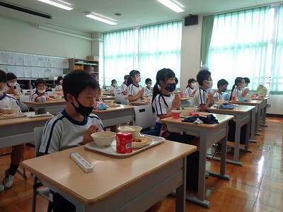 給食は、密にならないよう列毎に給食を取りに来ています。3品を手際よくおぼんにのせ、自分のところに戻ると合掌して待ちます。きんぴらのシャキシャキした食感、あつあつの五目豆腐をおいしく頂きました。
