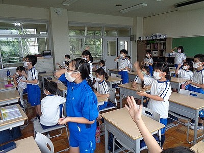 エイサーの練習に取り組みました。最後までの流れを知り、基本となる動きを手の動きを中心に練習しました。