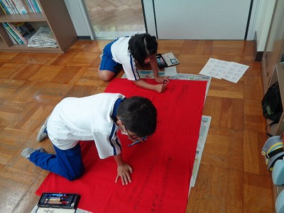 学活では、応援旗作りの続きをしました。先週までに有志の人が応援キャラクターを書いてくれていたので、その周りに一人一人が意気込みを書いていきました。