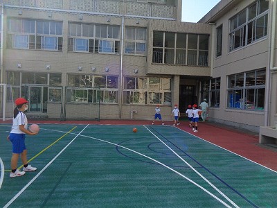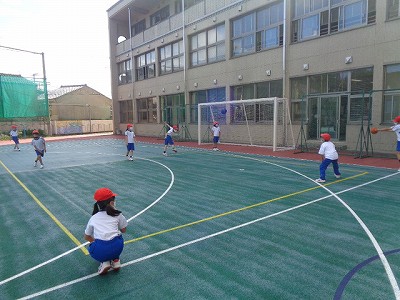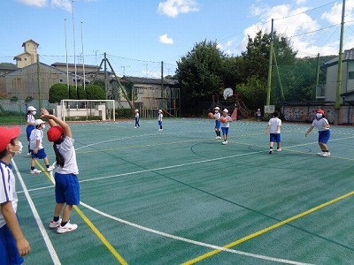 ラジオ体操とエイサーの練習から始めました。今日の練習は、みんなの向く方向がそろってきました。そして後半は、キックベースです。チームごとに分かれて、ボールキャッチや 蹴る練習をしました。