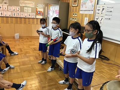 1学期の学習で少しふれていた曲です。“コンガ”の低音リズムに、「カシャカシャ系」の“カバサ”や“シェーカー”を選んでいる友達がいました。