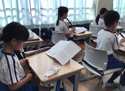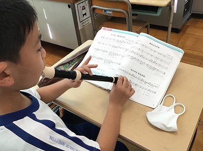 教室では、リコーダー奏「森のささやき」を練習しました。「シから高いレ」に移る指使いに馴れてきた3年キッズ。