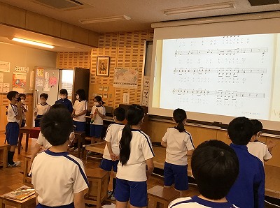 「マンガニ、雨とおどろう♪」の合唱の練習をしました。2つのメロディが紹介されているので、今日は、3年キッズの歌声ハーモニーづくりに挑戦です。