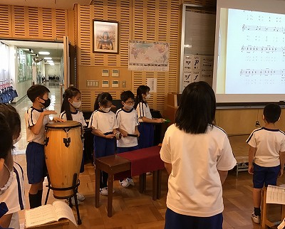前の時間に使っていたリズム楽器も取り入れて、ゆったりのんびりの雰囲気が伝わる“マンガニ”の世界に浸ることができました。