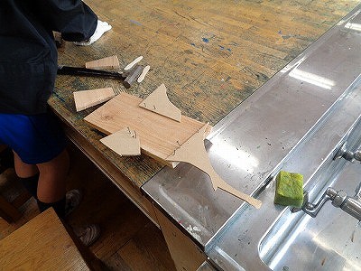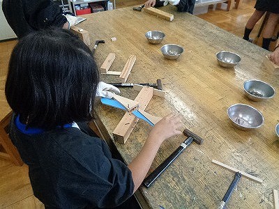釘が曲がってしまったり、打つ場所を変えたりしたい時には、釘抜きを使って釘を抜かなければなりません。はじめはかなり苦戦していたのですが、ずいぶん慣れてきたようです。それでも抜けないときには、友達と協力し合っていました。