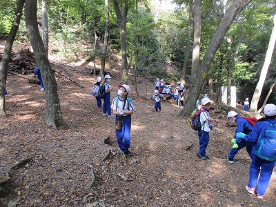 秋晴れの遠足日和となりました。お家の方が用意してくださったお弁当を背に出発しました。