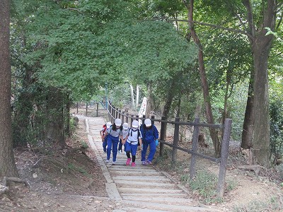 最後の関門!?連続する階段道です。「もうちょっとやで~」と励まし合って進みます。