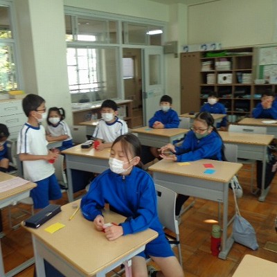 そして、その後は、月かげ集会のように四色カードを使って、「学校生活・友達」をテーマにして自分の意見を伝え合いました。