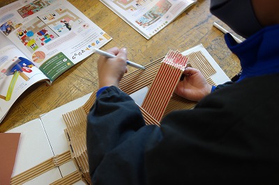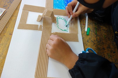 片面ダンボールをひと通り使い終わると、いよいよ自分のアイデアで周りの様子を描き始めました。