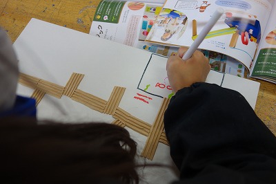 そこへ、片面ダンボールをテープ状に切ったものを使って、磁石を動かす道にしたり、障害物にしたりするものをはっていきました。中にはトンネルや橋のように、立体的に使っている児童もいました。
