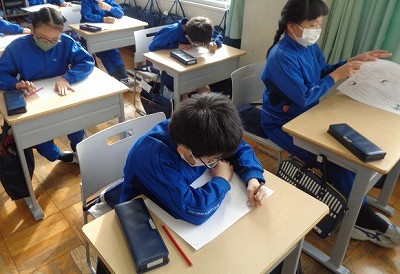 毎回使用している練習半紙を使って、習字の練習をしました。それに加えて、今日は人権月間の取り組みとして、墨で絵と言葉を書いて「大事にしたい言葉」を書きました。まずは、半紙を切り取ります。