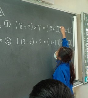 左の式は、かっこの中を計算して5をかけて答えを求め、右の式は別々にかけ算してから足して答えを求める。そして、二つの式は同じ答えになるということを前の時間に学習しました。