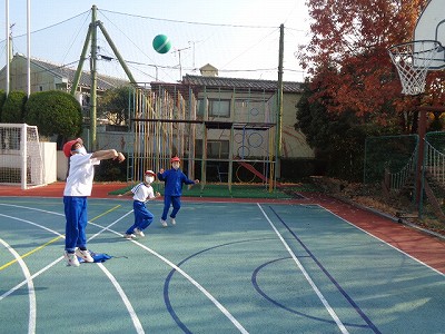 休み時間、いいお天気になり、運動場ではドッジボールとバスケットボールで遊ぶ人がたくさんいました。