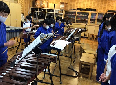 教室では、リコーダーの二重奏と鍵ハモによる低音パートでの合奏を行いました。自分の机の前だけで吹くことに決めています。並び方を変えることはできませんが、吹奏の楽器に持ち替えても、しっかりと役割を果たしていました。