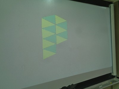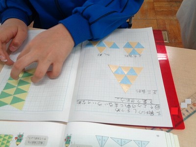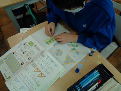 2学期より学習してきた三角形の学習も終盤です。今日は、正三角形や二等辺三角形をしきつめた模様の中から色々な形を見つけたり、作ったりしました。