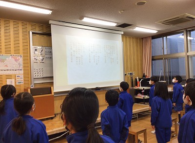 三学期の音楽が始まりました。気持ちを新たにする思いで、「校歌」を斉唱するところからスタートです。
