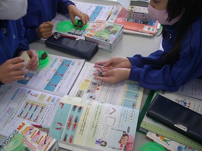 今日は、N極とS極の性質について調べました。同じ極同士は引き合い、違う極同士は退け合う事を確認すると、学習したことを生かして、ドーナツ磁石にN・Sのシールを貼っていきます。