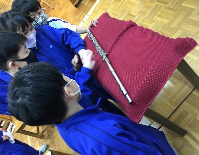 フルートとハープが活躍するメヌエットの冒頭は、やさしくやわらかなフルートの音色と、ポンポンと弾むようなハープの演奏がよく合っていたことを思い出し、プリントに感想の続きを記入する友達がいました。