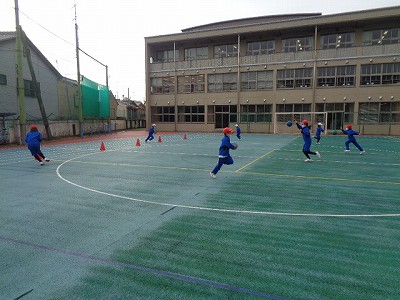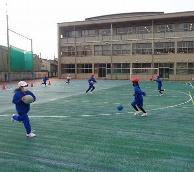 今日の体育は、ドリブルの練習を中心に取り組みました。