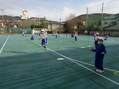 走る速さに合わせて、ボールを上手にバウンドさせ、帰りは全力疾走です。