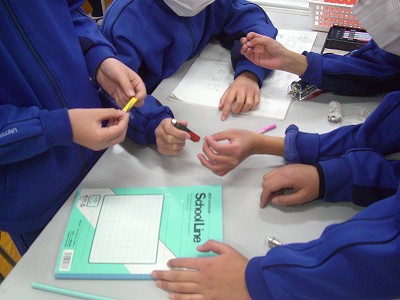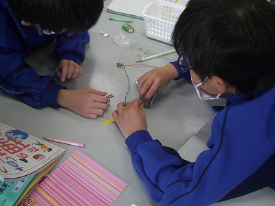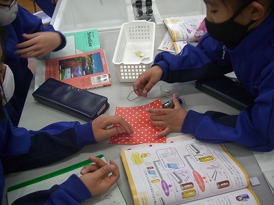 今日は、今までに学習した「豆電球」と「磁石」を使って、いろいろな物の仲間分けをしました。