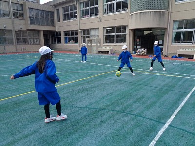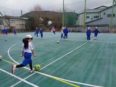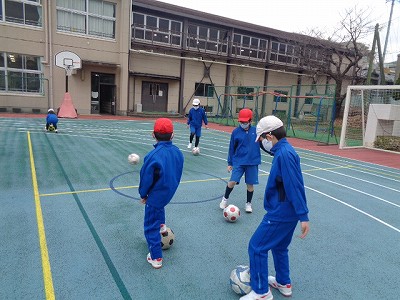はじめは、ドリブルの練習です。運動場を2周したり、ドリブルをしながら自分のボールを守り、他の人のボールを外へ蹴り出す遊びもしました。