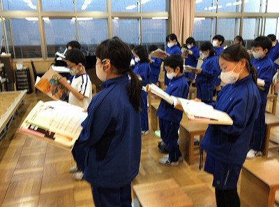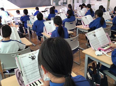 教室に戻り、短い時間の中で、鍵ハモパートの練習開始です。途切れずに最後まで吹けたという人が、少しずつ増えてきたようです。オルガンのメロディと合わせて、鍵ハモパートを演奏してみると…