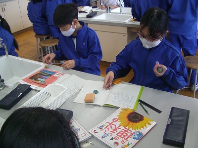 次に、「同じ体積で、素材が違う」3種類の玉の重さを調べました。