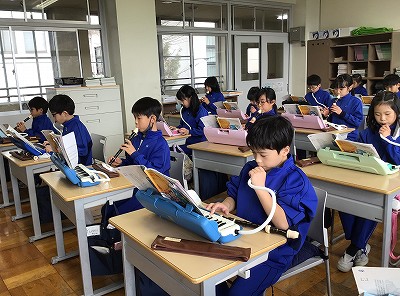 今日は後半に、音楽室の楽器を使って、主旋律(リコーダーで)、オブリガード(鍵ハモで)、低音(鍵ハモで)のパートを奏でてみようと提案しました。