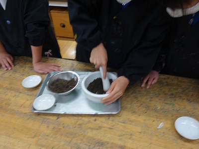 まずは、あらかじめとっておいたビオトープの土を、乳鉢を使ってすりつぶしました。