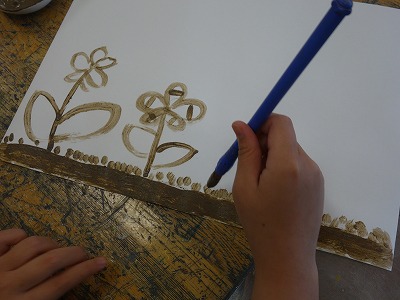 今日はビオトープの土を使って、絵を描く学習です。