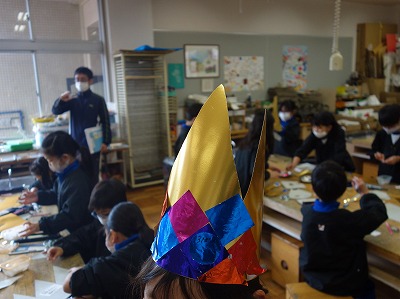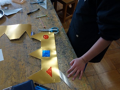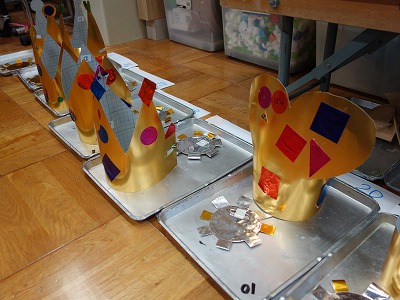 ぴかぴかの冠ができあがりました。後片付けなども含めて、協力し合いながら必要な数をつくることができました。