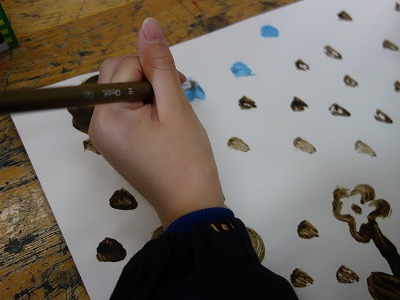 土で描いた絵がすっかり乾いている様子を見ると、絵の具やカラーペンを併せて使いたいという児童の要望が多くありました。そこで、今日は土の色を生かすことをめあてにして、他の材料で描き足していく時間となりました。