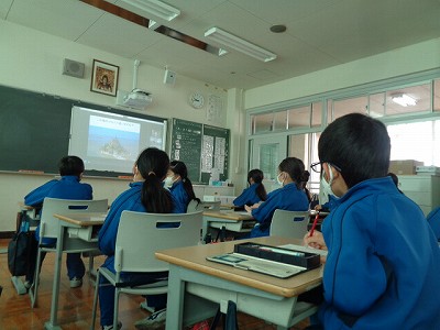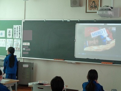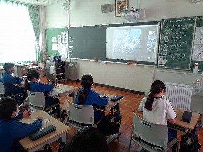 英語科の時間です。今回はフランスの方をゲストティーチャーに迎え、オンラインでお話を聞きました。