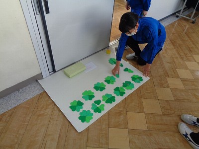 作ってきた「四つ葉のクローバー」です。今日は、一人一人が班長さんへメッセージを書きました。