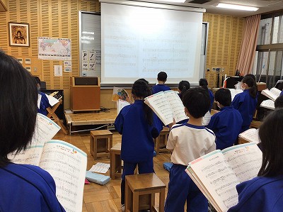 まずは、「♪音楽のおくりもの」の歌唱練習を行いました。“全校で歌えるときが来てほしいな”という願いのもと、全学年の教科書に載っている曲に取り組みます。