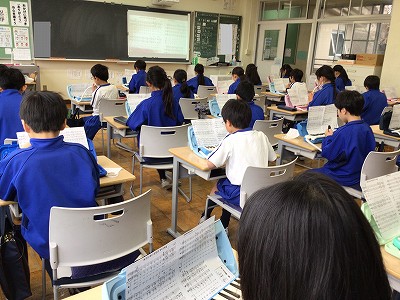 今日から「♪ミッキーマウスマーチ」の練習を始めます。音楽室で、ドレミの階名唱を行った後、教室で鍵ハモの練習に取り組みました。
