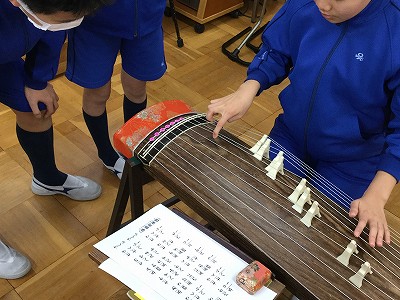 学習の後半には、皆さんにも “お琴(こと。お琴で奏でる曲を箏曲=そうきょくといいます)”を弾いてもらおうと考えています。このショットは、この前 卒業した6年生が ♪さくらさくらに チャレンジしている場面です。