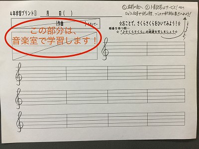 学校から届けた「レターパック」の中に、「さくらさくら」の教科書コピーと 五線のプリントが 入っていたはずです。それが、今日の課題です。