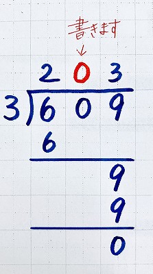 まずは6÷3で2をたてて、つぎは0÷3で…